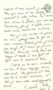 Dieu ! non, je ne connais personne à Saint-Pétersbourg, si ce n’est M. Stassioulevitch, le directeur du Messager de l’Europe, et encore pas assez intimement pour me permettre de vous adresser à lui, Je regrette bien ma sauvagerie qui me rend si réfractaire aux relations nouvelles.{CR}Mais vous devez déjà avoir là-bas des amis, car vous êtes cosmopolite, vous vous trouvez partout chez vous. Et, puisque la Russie vous surprend et vous émeut, je compte bien que vous m’en causerez longuement à votre retour. En mars, nous serons à Paris, que vous ne traverserez pas, je l’espère, sans venir nous demander à diner.{CR}Moi, je suis encore ici pour un mois, plongé dans la fin de mon roman [La Joie de vivre]. Depuis juin, je n’ai pas bougé, et j’avoue que je suis très las. Mais, que voulez-vous ? ma besogne est lourde, il me faut cet effort pour la mener à bien »…