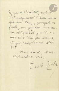 Émile ZOLA. L.A.S., Médan 14 février 1886, à un « cher confrère » ; 2 pages in-8.{CR}Il ne peut rien promettre, « car je n’ai plus même des fonds de tiroir, et je suis enfoncé dans un tel travail, qu’il m’est impossible de...