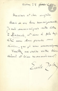 Émile ZOLA. 3 L.A.S., Médan février-août 1886 ; 3 pages et quart in-8.{CR}28 février. Il va communiquer la lettre de son confrère à Busnach, « et dans le plus bref délai nous allons prendre une décision »…{CR}13 juillet. Il est...