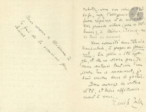 n’est pas cher, mais j’en aurais voulu un plus orné. Ne pourriez-vous voir celui de Lyon et me dire s’il vaut vraiment les 250 fr ? Dans ce cas, vous me l’achèteriez et vous me le feriez monter, avant de me l’envoyer »…{CR}Puis il parle de l’adaptation de Germinal au Châtelet (21 avril-7 mai 1888) : « Nous avons été dans une vraie bousculade, à propos de Germinal. La pièce a été égorgée, et elle ne vivra pas. Je vous conterai tout cela un jour. En ce moment, je suis encore dans le gâchis »...
