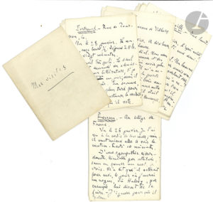 a noté le nom de l’académicien, son adresse, la date de la visite, et le compte rendu de l’entrevue.{CR}Ces fiches concernent : Joseph Bertrand, Albert de Broglie, Victor Cherbuliez, Jules Claretie, François Coppée, Camille Doucet, Maxime Du Camp, Alexandre Dumas fils, Octave Feuillet, Octave Gréard, Ludovic Halévy, Paul-Gabriel d’Haussonville, Charles Leconte de Lisle, Ernest Legouvé, John Lemoinne, Ferdinand de Lesseps, Xavier Marmier, Charles de Mazade, Henri Meilhac, Alfred Mézières, Édouard Pailleron, Louis Pasteur, Ernest Renan, Edmond Rousse, Camille Rousset, Victorien Sardou, Léon Say, Jules Simon, Hippolyte Taine, Sully Prudhomme, Eugène-Melchior de Vogüé.{CR}Citons-en quelques-unes.{CR}« Dumas. Avenue de Villiers, 98. Vu le 27 janvier. À dix heures. Resté une demi-heure. Accueil très cordial. Nous avons causé de tout, des honneurs et des écrivains. Je dois lui avoir plu. Le passé est effacé. Il m’a accompagné jusqu’à la porte de son hôtel ; et, si j’ai bien compris, il sera pour moi une autre fois. – On m’a dit qu’il était engagé à l’égard d’Houssaye. »{CR}« Leconte de Lisle. Boulevard Saint-Michel, 64. Vu le 25 janvier. De 10 à 12. Resté un quart d’heure. Très cordial accueil, bien qu’il eût tonné contre moi. Avons causé gaiement et méchamment. N’a pas l’air de dérager. – Je ne sais pour qui il vote. »{CR}« Pasteur. Rue Dutot, 27 Vu le 25 janvier. Le matin, de 9 à 10. Resté dix minutes. Nous n’avons guère causé de l’Académie. Je l’ai félicité de ses grandes découvertes, et il a offert de me faire assister aux inoculations. J’ai promis de retourner voir ça. Un homme très affaibli, la parole difficile, parlant fortement du nez – Je ne sais pour qui il vote. »{CR}« Taine. 23, rue Cassette. Vu le 25 février. Il reçoit tous les samedis, de 4 à 7. Resté trois quarts d’heure. Amical, m’a rappelé nos anciennes relations. Il m’a fait l’éloge de Fabre, de Loti et de Becque, sans me dire un mot de mes livres. Je doute qu’il vote jamais pour moi. J’ignore pour qui il votera. »{CR}On joint un petit dossier autographe titré : Dossier de l’Académie, avec liste des académiciens avec leur adresse dans l’ordre de leur élection, et 7 notes (la plupart au crayon) : liste de candidats, listes des visites, « Ceux qui ont voté pour moi, élection du 2 juin 92 », etc. ; plus des coupures de presse, sur lesquelles Zola a noté la date.