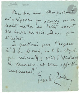 Émile ZOLA. L.A.S., [22 novembre 1890], à son éditeur Georges Charpentier ; 1 page in-12, adresse au dos (Télégramme).{CR}Pour l’inauguration du monument à Flaubert à Rouen (23 novembre).{CR}« Maupassant m’a répondu que jamais on ne...
