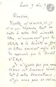 Émile ZOLA. L.A.S., Paris 9 décembre 1891, [à Georges de Salverte ?] ; 1 page et demie in-8.{CR}Il le remercie de sa lettre « annonçant que les statuts de la Société des Gens de lettres venaient enfin d’être approuvés par le Conseil...