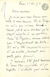 Émile ZOLA. L.A.S., 16 décembre 1896, [à l’actrice Marie Laurent] ; 1 page et demie in-8.{CR}Il n’a pu réussir auprès de F. de Rodays : « il m’a déclaré qu’il était résolu à ne publier dans le Figaro aucun article sur...