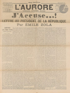 Dreyfus.{CR}Cette lettre-manifeste, adressée au Président Félix Faure, à la « une » du journal L’Aurore, dirigé par Ernest Vaughan, parut deux jours après l’acquittement d’Esterhazy par le Conseil de guerre. Elle marque le début du combat pour la reconnaissance de l’innocence d’Alfred Dreyfus et sa réhabilitation. Elle vaudra à Zola des poursuites judiciaires, qui l’amèneront à s’exiler un temps en Angleterre.{CR}Bon état ; pliures d’origine.