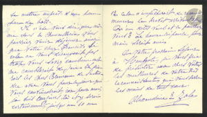 Elle demande à Frantz Jourdain de venir au cimetière Montmartre présenter lui-même « à tous nos amis, les intimes, les connus et les inconnus, le superbe monument que votre grande affection pour mon cher mari vous a inspiré ». Au lendemain de cette réunion, en remerciement et admiration de son œuvre, elle le prie d’accepter le « couteau à papier » que Zola utilisait à Médan. – 24 août. Elle se réjouit qu’il vienne déjeuner à Médan avec Alfred Bruneau à qui il doit remettre, comme parrain, le brevet d’officier de la Légion d’Honneur ; elle veut l’entretenir d’un problème de limite de terrain…