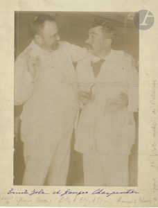 [Émile ZOLA]. 4 lettres et documents divers, et 3 imprimés.{CR}Photographie d’Émile Zola avec son ami l’éditeur Georges Charpentier, annotée par Catherine Stevens (15,3 x 11 cm, montée sur carte).{CR}Victor MARGUERITTE. L.A.S. à Hugues...