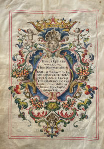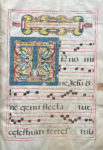 Manuscrit musical calligraphié en noir et rouge sur vélin orné d'un riche décor de lettrines et initiales peintes en polychromie, d'une grande lettrine peinte en-tête de chaque mois et d'un riche médaillon de grotesques à pleine page contenant la souscription.