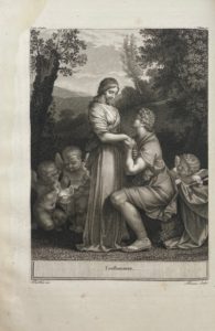 Paris, P. Didot l’aîné, 1797. In-folio, maroquin olive, bordure de grecques et filets dorés, dos orné, dentelle intérieure, doublure et gardes de soie jaune, tranches dorées (Reliure de l'époque).Superbe édition typographique de Pierre Didot ornée de quatre figures hors texte dessinées par Pierre-Paul Prud'hon et gravées à l'eau-forte par lui-même (1) – c'est « la seule gravure que le maître ait incontestablement faite », selon Cohen – ou bien Beisson (2) et Copia (1).
