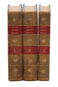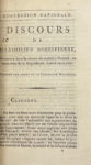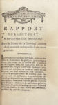 Détail des pièces : I. DUPORT (Adrien) : Opinion prononcée à la séance du matin 14 juillet 1791. Imprimée par ordre de l'Assemblée Nationale. Nantes, Imprimerie d'A.-J. Malassis, 1791, 13 pp. Sur l'achèvement de la Constitution. – II. BARERE DE VIEUZAC (Bertrand) : Rapport fait au nom du Comité de salut public, sur la mission civique des envoyés des assemblées primaires du peuple français, dans la séance du 14 août 1793. Imprimé par ordre de la Convention. [Paris], Imprimerie Nationale, s.d. [1793], 14 pp. – III. MERLIN DE DOUAI (Philippe-Antoine) : Rapport fait à la Convention Nationale, au nom du Comité de salut public, sur les bruits de paix. [Paris], Imprimerie Nationale des lois, s.d. [1793], 8 pp. – IV. BILLAUD-VARENNE (Jacques-Nicolas) : Décret du 14 frimaire, précédé du Rapport fait au nom du Comité de salut public, sur un mode de gouvernement provisoire & révolutionnaire, à la séance du 28 brumaire, l'an second [18 novembre 1793]. Paris, Imprimerie Nationale, s.d. [1793], 24 pp. – V. BO (Jean-Baptiste) : Discours prononcé par le citoyen Bo, représentant du peuple dans les départements du Cantal et du Lot, à la séance de la société populaire montagnarde d'Aurillac, le 13 pluviôse. Réimprimé à Nantes, d'après le voeu de la société populaire. Nantes, Imprimerie de Malassis, s.d. [1793], 28 pp. – VI. SAINT-JUST (Louis-Antoine de) : Rapport sur les actions de l'étranger, et sur la conjuration ourdie par elle dans la République française, pour détruire le gouvernement républicain, par la corruption, et affamer Paris ; fait à la Convention Nationale le 23 ventôse, l'an II [13 mars 1794], au nom du Comité de salut public. Imprimé par ordre de la Convention. [Paris], Imprimerie de la société des jeunes élèves de la patrie, s.d. [1794], 24 pp. – VII. SAINT-JUST : Rapport à la Convention Nationale, dans la séance du 11 germinal [31 mars 1794], au nom des Comités de salut public & de sûreté générale. Nantes, Imprimerie de Malassis, s.d. [1794], 35 pp. Contre les dantonistes. – VIII. BILLAUD-VARENNE : Rapport fait à la Convention Nationale, au nom du Comité de salut public, dans la séance du premier floréal, l'an 2 [20 avril 1794], sur la théorie du gouvernement démocratique, et sa vigueur utile pour contenir l'ambition, et pour tempérer l'essor de l'esprit militaire ; sur le but politique de la guerre actuelle, et sur la nécessité d'inspirer l'amour des vertus civiles par des fêtes publiques et des institutions morales. Imprimé par ordre de la Convention nationale. Paris, Imprimerie Nationale, s.d. [1794], 16 pp. – IX. ROBESPIERRE (Maximilien) : Rapport fait au nom du Comité de salut public, sur les rapports des idées religieuses et morales avec les principes républicains, et sur les fêtes nationales. Séance du 18 floréal, l'an second [7 mai 1794]. Imprimé par ordre de la Convention Nationale. Paris, Imprimerie Nationale, s.d. [1794], 45 pp. Avec, in fine, le plan de la Fête à l'Etre suprême [conçu par David]. – X. ROBESPIERRE : Discours prononcé dans la séance du septidi 7 prairial, an deuxième [26 mai 1794]. S.l.n.d. [1794], 8 pp. – XI. BARERE : Rapport sur les crimes de l'Angleterre envers le peuple français, et sur ses attentats contre la liberté des nations, fait au nom du Comité de salut public, dans la séance du 7 prairial l'an second [26 mai 1794]. Imprimé par ordre de la Convention nationale. Paris, Imprimerie de Charpentier, s.d. [1794), 30 pp. Les pp. 9-24 de ce texte ont été reliées par erreur à la suite de la pièce précédente. – XII. BARERE : Rapport fait à la Convention nationale, au nom du Comité de salut public, dans la séance du 13 prairial [1er juin 1794], sur l'éducation révolutionnaire, républicaine & militaire ; et décret sur la formation de l'Ecole de Mars, imprimés par ordre de la Convention nationale. [Paris], Imprimerie nationale, s.d. [1794], 16 pp. – XIII. LACOSTE (Elie) : Rapport fait au nom des Comités réunis de salut public et de sûreté générale, sur la conspiration de Batz, ou de l'étranger ; dans la séance du 26 prairial, l'an deuxième [14 juin 1794]. Imprimé par ordre de la Convention nationale. Paris, Imprimerie Nationale, s.d. [1794], 15 pp. – XIV. VADIER (Marc-Guillaume-Alexis) : Rapport et projet de décret, présentés à la Convention nationale, au nom des Comités de sûreté générale & de salut public, séance du 27 prairial, l'an deuxième [15 juin 1794]. Imprimés par ordre de la Convention. [Paris], Imprimerie Nationale, s.d. [1794], 15 pp. – XV. BARERE : Rapport fait au nom du Comité de salut public, sur la prise de Charleroi ; séance du 9 messidor, l'an second [27 juin 1794]. Imprimé par ordre de la Convention nationale, et envoyé aux armées. [Paris], Imprimerie de Quiber Palissaux, s.d. [1794], 8 pp. – XVI. BARERE : Rapport fait au nom du Comité de salut public, sur la bataille de Fleurus donnée le 13 prairial ; séance du 11 messidor, l'an 2 [29 juin 1794]. Imprimé par ordre de la Convention nationale. Paris, Imprimerie Nationale, s.d. [1794], 7 pp. – XVII. BARERE : Rapport fait au nom du Comité de salut public, sur la suite des événemens du siège d'Ypres, et sur les monumens nationaux environnans Paris. Séance du 13 messidor, l'an 2 [1er juillet 1794]. Imprimé par ordre de la Convention nationale, et envoyé aux armées. [Paris], Imprimerie Nationale, s.d. [1794], 4 pp. – XVIII. BARERE : Rapport fait au nom du Comité de salut public, sur l'héroïsme des républicains montant le vaisseau le Vengeur, dans la séance du 21 messidor, l'an 2e [9 juillet 1794]. Imprimé par ordre de la Convention nationale. [Paris], Imprimerie de Quiber-Pallissaux, s.d. [1794], 8 pp. – XIX. BARERE : Rapport fait au nom du Comité de salut public, sur le progrès des armées de la République, séance du 21 messidor, l'an 2 [9 juillet 1794]. Imprimé par ordre de la Convention nationale. [Paris], Impr