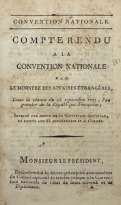 Tome I : 1. LEBRUN-TONDU. Compte rendu à la Convention Nationale par le ministre des affaires étrangères, dans la séance du 25 septembre 1792. [Paris], de l'Imprimerie Nationale, s.d., (1792), 14 pp. 2. LEBRUN-TONDU. Lettre du ministre des affaires étrangères, au président de la Convention Nationale, par laquelle il fait part d'un arrêté pris par la société établie à Rochester pour la propagation des droits de l'homme. [Paris], de l'Imprimerie Nationale, s.d. (1792), 3 pp. 3. LEBRUN-TONDU. Lettre au président de la Convention Nationale. A Paris, de l'Imprimerie Nationale, 1792, 12 pp. 4. SCHIEFER (J.-F.). et HERAULT. Adresse des Amis du Peuple de la Grande-Bretagne, de la ville de Newington, à la Convention Nationale de la République française, suivie de la réponse du président de la Convention aux deux sociétés de Manchester, à celle de Norwich, aux Wighs constitutionnels, et à la société de Newington. [Paris], de l'Imprimerie Nationale, s.d. (1792), 4 pp. 5. LEBRUN-TONDU. Lettre du ministre des affaires étrangères au président de la Convention Nationale, en date du 30 janvier 1793, l'an 2 de la République. Suivie de la lettre de lord Grenville au citoyen Chauvelin, datée de Witheal du 24 janvier 1793, et de la traduction de l'Ordre du roi d'Angleterre, du même jour, communiqué au citoyen Chauvelin. A Paris, de l'Imprimerie Nationale, 1793, 7 pp. 6. ADRESSE des Anglois, des Ecossois et des Irlandois résidans et domiciliés à Paris, à la Convention Nationale, et réponse du président. Suivies du discours prononcé à la barre de la Convention par les députés de la Société Constitutionnelle de Londres, de l'Adresse de cette société à la Convention, et de la réponse du président. Séance du 28 novembre 1792. [Paris], de l'Imprimerie Nationale, s.d. (1792), 8 pp. 7. ADRESSE d'une société anglaise à la Convention Nationale, suivie de la réponse du président, lue à la séance du 22 novembre 1792. [Paris], de l'Imprimerie Nationale, s.d. (1792), 10 pp. 8. ADRESSE à la Convention Nationale de France, par les sociétés de Bretons unies dans une cause commune, c'est-à-dire pour obtenir une représentation juste, égale et impartiale dans le Parlement. Lue à la séance du 7 novembre 1792. A Paris, de l'Imprimerie Nationale, 1792, 7 pp. 9. LETTRE des patriotes Polonais restés en Pologne, à leurs concitoyens réfugiés en France, sur l'état actuel de la Pologne, relativement aux autres puissances de l'Europe, traduite sur l'original. S.l., De l'Imprimerie du Magazin Encyclopédique, s.d., 24 pp. 10. [WYBICKI (J.)]. Mémoires pour servir à l'histoire des révolutions de Pologne, particulièrement à celle de 1794. Par un citoyen polonois. A Paris, à la Librairie Républicaine, An III, VIII-88 pp. 11. DISCOURS prononcé à la barre de la Convention Nationale, par les réfugiés polonais, au nom de leur nation, le 6e jour complémentaire, l'an 3e de la République française, 22 septembre 1795. S.l., de l'Imprimerie de Belin, s.d., (1795), 15 pp. 12. TURSKI (W.). Adresse d'Albert Le Sarmate (ci-devant Truski, nonce Polonois), à la Convention Nationale, le dimanche 30 décembre 1792. [Paris], de l'Imprimerie Nationale, s.d., (1792), 7 pp. 13. DUCHER. Nouvelle alliance à proposer entre les républiques française et américaine. S.l.n.d, (1792), 8 pp. 14. GREGOIRE (H.). Rapport sur l'Ordre de Malte. [Paris], de l'Imprimerie Nationale, s.d., 8 pp. 15. MEMOIRE des députés de Francfort à la Convention Nationale, au sujet de la reprise de cette ville par les troupes allemandes. S.l., Ve Hérissant, 1793, 24-42 pp. 16. GORANI (Joseph). Pétition à la Convention Nationale de France, pour les habitans de la ville de Francfort-sur-le-Mein. S.l., de l'Imprimerie de Pougin, s.d., (1792), 8 pp. 17. BAULIEU. Relation exacte de l'affaire des Francfortois, depuis l'établissement d'une garnison française dans Francfort, jusqu'à la prise de cette ville par les Prussiens. S.l., de l'Imprimerie de Guillaume, s.d. (1793), 15 pp. 18. ADRESSE du grand-bailliage de Berg-Zabern à la Convention Nationale, lue à la séance du 19 novembre 1792. [Paris], de l'Imprimerie Nationale, s.d. (1792), 3 pp. 19. CARNOT (L.). Rapport et projet de décret, sur la réunion au territoire de la République, de plusieurs enclaves et pays circonvoisins, présentés au nom du comité diplomatique, le 14 février 1793. [Paris], de l'Imprimerie Nationale, s.d. (1793), 19 pp. 20. DENTZEL. Rapport et projet de décret sur la réunion au territoire de la République française, de trente communes enclavées sur les bords du Rhin, entre Landau et Wissembourg. [Paris], de l'Imprimerie Nationale, s.d., 8 pp. 21. ADRESSE d'une société allemande à la Convention Nationale, précédée de la Lettre d'envoi du citoyen François (de Neufchâteau). Lues à la séance du 16 novembre 1792. [Paris], de l'Imprimerie Nationale, s.d. (1792), 4 pp. 22. PROCES-VERBAUX de l'assemblée nationale des Allobroges. A Paris, de l'Imprimerie Nationale, 1792, 78 pp. 23. ROBERT (F.). Opinion sur la réunion de la Savoie à la France. [Paris], de l'Imprimerie Nationale, s.d., 12 pp. 24. DUBOIS-DUBAIS (L. T.). Projet de proclamation aux Savoisiens. Du 30 septembre 1792. [Paris], de l'Imprimerie Nationale, s.d. (1792), 4 pp. 25. ADRESSE de la société des Amis de la Liberté et de l'Egalité séante à Chambéry, à la Convention Nationale de la République française. Le 12 octobre 1792. [Paris], de l'Imprimerie Nationale, s.d. (1792), 3 pp. 26. ADRESSE des Savoisiens résidans à Paris, à la Convention Nationale, présentée le 14 octobre 1792. Suivie de la réponse du président. A Paris, de l'Imprimerie Nationale, s.d., (1792), 3 pp. 27. LA SAVOIE et Genève. S.l.n.d. (1792), 2 pp. 28. NOTE remise par les Allobroges. S.l.n.d. (1792), 2 pp. 29. DISCOURS prononcé à la barre de la Convention Nationale, par les Savoisiens résidans à Paris, le 11 novembre 1792. Suivi de la réponse du président. [Paris],