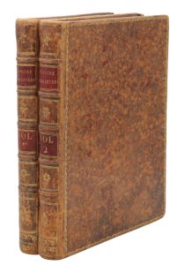 DAVID (François-Anne). Histoire d'Angleterre, représentée par figures accompagnées de discours. Paris, chez l'auteur F.-A. David, 1784. 2 volumes in-4, veau ocelé, roulette dorée, dos orné, pièces de titre et de tomaison rouges, tranches jonquille (Reliure de l'époque). Belle illustration gravée par François-Anne David comprenant 2 titres gravés et 96 planches dessinées par Lejeune, Binet, Gois, Monnet, Mortimer et d’après Van Dyck. Elle est accompagnée d'un précis historique rédigé par Pierre Letourneur et l'abbé Guyot. Le texte est celui de l’édition en 194 et 211 pp., sans dédicace à Monsieur, dans laquelle les estampes portent un numéro et une indication de tomaison. Le supplément publié en 1800 par Jean Milcent n’est pas joint. De la bibliothèque du Dr Victor Cuenod, avec ex-libris. Minimes épidermures, quelques petites rousseurs et des planches légèrement roussies. Cohen, 274 – Brunet, II, 536.