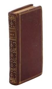 Paris, Ph.-D. Pierres, 1781. 2 tomes en un volume in-24, maroquin rouge, triple filet doré, dos lisse orné, dentelle intérieure, tranches dorées (Reliure de l'époque).Édition originale.
