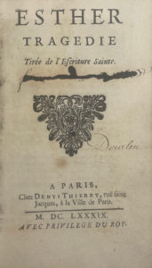 Composée à la demande de Mme de Maintenon pour les demoiselles de Saint-Cyr, Esther fut créée le 26 janvier 1689 à la Maison royale de Saint-Louis à Saint-Cyr. Pour le récompenser de la qualité de sa pièce, Louis XIV nomma Racine gentilhomme ordinaire de sa Majesté.
