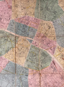 1839. Échelle 1:6666e. Plan gravé sur métal et rehaussé de couleurs, en deux feuilles divisées en 32 sections, entoilé au verso (97,5 x 135 cm). Important plan de Paris, mettant en évidence le réseau de conduites d'eau issues du canal de l'Ourcq par un système de rehauts de couleurs manuscrits, mais aussi les fontaines publiques, robinets de décharge et poteaux d'arrosement. Il a été exécuté par Achin et gravé par Dormier sous la direction de Léopold Emmery de Sept-Fontaines, ingénieur en chef directeur des eaux de Paris.