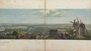 Panorama extrêmement rare, surtout complet des quatre feuilles, correspondant aux quatre points cardinaux et montrant la barrière des Vertus à l'est, Notre-Dame et le centre de Paris au sud, le mont Valérien à l'ouest et Saint-Denis au nord, avec les moulins de Montmartre au premier plan.