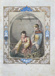 Paris, H. Gache ; Londres, C. Barbe, s.d. [vers 1845]. In-folio, bradel cartonnage de papier jaune, titre lithographié sur le premier plat (Reliure de l'éditeur).Premier tirage de ce bel album de costumes féminins chinois, complet des 6 planches lithographiées par Gaspard Gsell d'après les aquarelles d'Anaïs Colin-Toudouze, délicatement coloriées à l'époque et ornées d'encadrements tirés en bleu et or.
