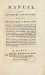 On joint : Manuel des autorités constituées de la République française. Paris, Dufart, Dessenne, 1797. In-18, broché, non rogné. Édition originale, ornée d'un frontispice allégorique, d’une carte repliée et de 33 planches gravées d'après Quéverdo, dont 15 costumes officiels en coloris de l’époque. C'est la seule année parue de cet almanach révolutionnaire. Exemplaire à toutes marges bien complet du Supplément pour l’an VI (pp. 397-408). Légers manques à la couverture. Grand-Carteret, n°1261 – Cohen, 675.