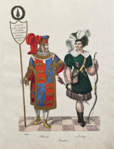 Ces quatorze planches représentent des couples habillés pour le bal masqué bavarois de 1827 en costumes médiévaux tirés d'Ivanhoé, le roman de Walter Scott (pl. 1-6) ou en costumes hongrois, italien, bédouin, grec, albanais et polonais (pl. 7-12) ; enfin, deux scènes de groupe montrent différents costumes inspirés du carnaval romain (pl. 13-14).