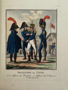 Prague, Franz Zimmer, s.d. [vers 1812]. Grand in-8, cartonnage vert d'eau, écusson de titre typographique sur le premier plat (Reliure de l'époque).« Suite rarissime » (Colas), composée d'un titre en noir et de 18 planches aquarellées à l'époque d'uniformes de l'armée napoléonienne, le tout gravé en taille-douce par l'artiste tchèque Johann Berka (1758-v. 1820).