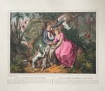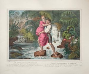 Paris, lith. Turgis ; Saint-Gaudens, Casse frères, s.d. [vers 1840]. Grand in-folio oblong, toile violette, étiquette de titre sur le premier plat (Reliure moderne).Suite rarissime de quatre lithographies anonymes somptueusement coloriées et gommées, légendées en français et en espagnol : 1. Paul et Virginie passant le torrent. – 2. Paul et Virginie égarés dans la forêt. – 3. Séparation de Paul et de Virginie. – 4. Mort de Virginie.