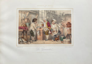 Paris, Aubert & Cie, s.d. [vers 1860]. In-folio oblong, cartonnage blanc, titre dans un décor lithographié en bleu et or sur le plat supérieur, dos lisse muet (Reliure de l'éditeur).Premier tirage de cette rare suite complète d'un titre en bleu et or et de 12 planches d'Henri de Montaut lithographiées en deux tons par Berr et Haguental & Fagonde. Il existe aussi une suite de Vertus et qualités par le même artiste.
