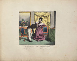 Cette série d'estampes présente avec humour l'écart entre ce qu'on dit et ce qu'on pense dans la bonne société de la Restauration par un système de double légende.
