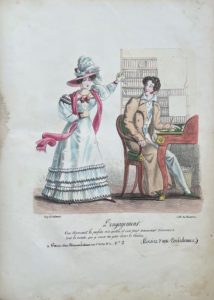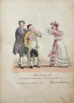 Paris, P. Marino, s.d. [vers 1825]. In-folio, bradel demi-percaline verte, premier plat de couverture (P. Goy & C. Vilaine).Suite rare de 12 planches d'Auguste de Valmont lithographiées par Ducarme et coloriées à l'époque, complète de la couverture lithographiée servant de titre. Elle fait suite à l'Histoire d'un comédien du même artiste.