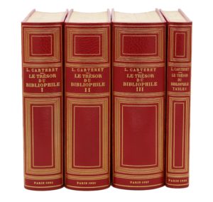 Paris, Carteret, 1924-1928. 4 volumes grand in-8, demi-maroquin rouge avec coins sertis d'un filet doré, dos lisse orné de filets dorés, tête dorée, non rogné, couverture et dos (Klein).Édition originale de cette bibliographie de référence sur les éditions originales des principaux ouvrages littéraires et illustrés du XIXe siècle. Elle est illustrée de nombreuses reproductions à pleine page, en noir et en couleurs.