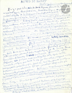 paru dans Les Lettres françaises, n° 667, 18 avril 1957. Le manuscrit présente des ratures et corrections, avec deux versos d’un première rédaction biffée.{CR}« Il n’y a peut-être, de toute la prose française, rien qui m’ait tant appris, tant fait rêver, tant dérouté, que ce presque initial chapitre de La Confession d’un enfant du siècle : “Pendant les guerres de l’Empire, tandis que les maris et les frères étaient en Allemagne”… Ce chapitre-là, c’est peut-être la naissance du roman moderne », l’aube de Stendhal, Flaubert, Tolstoï, Zola, etc. Combien de fois a-t-il relu ce chapitre pour ses phrases sublimes, dont il cite plusieurs, alors que le reste du roman l’a toujours déçu : « Cette extraordinaire inégalité du préambule et du roman, à vrai dire c’est tout Musset »… Dans ses poèmes aussi, presque partout on trouve des vers (qu’il cite) qui le font aussi grand que Heine, Rimbaud, Baudelaire… Il parle aussi de son théâtre, qu’il ne goûte guère hormis Lorenzaccio et les Caprices ; mais surtout il y a Namouna « qui est tout ce que nous pouvons montrer dans notre langue à côté d’Eugène Onéguine, Namouna que je tiens pour un des plus grands poèmes jamais écrits »… Etc.