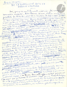 Louis ARAGON (1897-1982). Manuscrit autographe, signé en tête, Aragon vous parle : De la difficulté qu’il y a décrire l’histoire, [1959] ; 6 pages in-4 avec ratures et corrections.{CR}À propos de son livre en collaboration avec André...