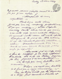Antonin ARTAUD (1896-1948). L.A.S., Rodez 15 Mars 1944, [à Mme Adrienne Régis, surveillante-chef de l’Asile de Rodez] ; 10 pages in-4 à l’encre violette.{CR}Très longue et intéressante lettre de Rodez, méditation sur l’amour et le sexe,...