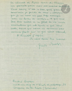 Loupiac de la Réole (Gironde), ainsi qu’il l’écrit au bas de la lettre. « On a été dispensés de la Kasbah et casés tant bien que mal dans les séchoirs à tabac »... Breton n’a plus de nouvelles de sa femme Jacqueline depuis quinze jours. ... « ma foi, je crois qu’une époque assez intéressante pourrait commencer, à condition toutefois de pouvoir la vivre. Il pourrait s’agir de l’enfance monstre de quelque chose, ou bien n’est-ce encore qu’un grossier déguisement. Le côté “douloureuse stupéfaction”, “stupeur attristée” bien rendu dans les derniers communiqués antagonistes anglais-français reste absolument prédominant. Voilà pour l’état de conscience qui se manifeste ici sans la moindre discrétion. Tout doucement ces messieurs retournent d’ailleurs leur veste de couleur kaki. On recommande aux hommes d’être “polis” avec les troupes d’occupation. Polis “sans obséquiosité” ajoute-t-on même assez psychologiquement ». Il ne sait où aller « en cas de démobilisation [...] Le climat de Paris avec M. Chiappe me paraît pour moi des moins salubres ». Il dit à sa correspondante qu’il en garde un « grand souvenir [...] vous êtes très mêlée à ce filet de vie encore cristalline qui est tout ce qui nous reste, tant que nous ne sommes pas mieux fixés sur ce qui nous attend »...