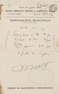 Louis-Ferdinand CÉLINE. P.A.S. « Dr Destouches », Clichy 14 décembre 1932 ; 1 page in-8 à en-tête Ville de Clichy (Seine). Services municipaux d’hygiène & d’assistance sociale. Dispensaires municipaux, cachet de pharmacie...