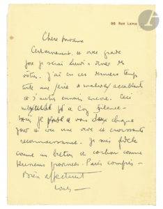 Louis-Ferdinand CÉLINE. L.A.S. « Louis », [28 décembre 1933], à Mme Lucien Descaves ; 1 page petit in-8 à l’adresse 98 Rue Lepic, adresse au dos.{CR}Il viendra dîner lundi « avec grande joie […] J’ai eu ces derniers temps toute une...