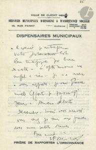 Louis-Ferdinand CÉLINE. L.A.S. « LF Destouches », 6 septembre [1934, à Évelyne Pollet] ; 3 pages in-8 à en-tête Ville de Clichy (Seine). Services municipaux d’hygiène & d’assistance sociale. Dispensaires municipaux.{CR}Il évoque...