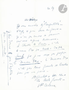 Line S.S. Ile de France]. Retour d’Amérique, où Mac Dougall et Little Brown ont refusé Mea culpa : « Avez-vous qq chose en vue pour l’Angleterre – où nous puissions le faire passer ? J’ai un traducteur possible à N. York, un nommé Parker ». Il le prie de lui envoyer « la traduction anglaise du ballet Naissance d’une fée. On me le demande à N. York ». Il lui demande aussi de « traduire un autre court ballet que je vais faire pour l’Exposition 37, Voyou Paul Brave Virginie. Je vous l’envoie »…{CR}98 Rue Lepic [mars]. Il s’interroge sur son contrat avec Chatto : « Cela veut dire qu’au cas où ils refusent Mea Culpa, je suis délivré de toute obligation vis-à-vis d’eux ? » Le contrat avec Little, Brown & Co est plus confus. Il donne carte blanche à Marks pour traiter avec des éditeurs anglais : « Je m’en fous après tout. Je veux simplement emmerder Chatto s’il fait aussi des petites manières »… Puis il évoque les démarches de Marks dans des galeries pour les peintures de Gen Paul. Quant au ballet Voyou Paul : « Quand il sera prêt, envoyez-moi. Je le fais parvenir en Amérique. On me le demande. Mais je n’ai pas beaucoup de chances avec les petits travaux et débouchés latéraux !.. A moi des dures épreuves ! »… {CR}Le 15 [avril ou mai]. Il demande de verser sur son « compte Highgate » l’argent pour Gen Paul qui est « dans l’ennui avec ses commandes à l’exposition. Blum ne paye personne » ; et de lui envoyer Virginie : « Certes vous pouvez publier tous ces ballets dans un journal si vous le désirez et au surplus prendre pour vous j’y tiens absolument le pognon qu’on voudra vous en donner. Cela vous dédommagera de votre travail et me fera bien plaisir »…{CR}21 [juillet]. Il sera absent de Paris en août et septembre, mais aimerait être « au courant des évolutions de mon Ballet. Sadlers Well serait une très jolie idée. Je peux leur faire faire la musique ici s’ils le désirent mais j’aimerai mieux qu’un anglais s’en occupe »..{CR}Le 27 [décembre]. Il lui envoie les Bagatelles. « Voyez ce qu’on peut en faire. Je n’ai pas envie de passer par une agence littéraire. Si Chatto le prend, c’est le même prix que Mort à crédit sauf que je ne veux pas payer l’Incom Tax. […] Je leur donne 8 jours d’option – oui, ou merde ».