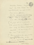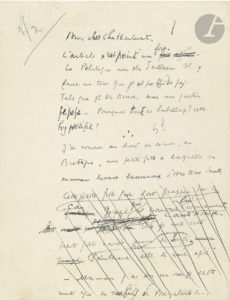 l’hebdomadaire collaborationniste La Gerbe.{CR}En janvier 1941, Céline avait reçu la visite d’Eitel Friedrich Moellhausen, diplomate allemand, qui lui demande un article pour La Gerbe ; Céline refuse d’abord, puis accepte d’écrire une lettre ouverte à Alphonse de Châteaubriant (1877-1951), fervent apôtre, avant-guerre, du rapprochement franco-allemand, puis de la collaboration, fondateur et rédacteur de La Gerbe, dont il sera peu après écarté par Moellhausen. Or la lettre de Céline fut publiée sous forme d’article, avec un titre « Acte de foi » (certes tiré du texte), et quelques modifications (dont édulcoration des grossièretés, suppression de certains noms propres), ce qui provoqua la colère de Céline, qui renvoya à Moellhausen son chèque, avec une lettre d’injure. Toujours antisémite, Céline se montre ici fort critique à l’égard de la Révolution nationale et des acrobates de la Collaboration.{CR}Le manuscrit de cette lettre ouverte est abondamment raturé et corrigé. Il est paginé de 1 à 13, mais avec 5 feuillets bis ajoutés (1, 2, 3, 7, 11). D’importants passages ont été biffés, et 8 feuillets portent au dos une première rédaction biffée. Le texte est bien rédigé comme une lettre, avec une formule d’adresse au destinataire en tête et en fin. {CR}« Mon cher Chateaubriant. / L’article n’est point mon fort. La Politique non plus d’ailleurs. Il y faut un tour que je ne possède pas »…{CR}Céline évoque une petite fille qui faisait des songes « après » des faits déjà survenus : elle « ne se trompait jamais de songes. Ce qui est drôle chez une petite fille de sept ans est encore plus drôle chez un auteur de quarante ans, seulement d’une autre façon. Je me réfère à tous ces livres, à tous ces articles, plaidoyers, mouvements, témoignages et leurs auteurs, qui paraissent, s’agitent, en nos zones [accablées biffé] sub-maudites, depuis juin. L’œuvre des “songeurs-après”. » {CR}Et Céline de railler le livre Après la défaite [de Bertrand de Jouvenel] : « Les œuvres des “songeurs après” sont toutes strictement réversibles. Elles ont ce caractère commun, et puis ne parlent jamais des juifs. Elles réservent l’avenir. […] Cent mille fois hurlés “Vive Pétain” ne valent pas un petit [“mort aux juifs” biffé 2 fois] “vive les youtres !” dans la pratique. Un peu de courage bordel Dieu ! […] Rapetisser, édulcorer les cyclones à la mesure “[petit biffé] menu-jean-foutre”, mesure française, c’est le but sournois. Voyez cher Chateaubriant, que nous sommes vraiment loin de compte. […] Il y a de tout dans vos journaux ! et re-de-tout pour ainsi dire ! Crypto, para, microni youtres ! On ne sait jamais avec ça qui va bien vous écrire dans le dos ! […] Et qu’est-ce que nouveau parti ? supernational, poustouflant ? Pantoufles ? […] C’est ça votre Révolution ? Mordons la nous ! Aux fous ! […] Qui se touche, ne se finit pas, s’énerve aux jeux insipides, fait bientôt sous lui… Nous y sommes. / Ah ! quand je vois ces gros Soviets comme ils ont bien vite “rapproché” de la gentille Lithuanie. Ah ! que ça n’a pas traîné, pas fait un pli ! pas un ouf ! Ah ! je demeure tout ébaubi, pensif, ravi, aterré. […] Il est un décret de nature que les fourmis toujours, toujours, mangeront les [limaces chenilles biffé] larves. / Charles Dieudonné, suisse parfait teint, délivre à M. Guitry des très hauts brevets de francisme. Il nous semonce de battre coulpe ! […] Je voudrais que M. Guitry nous dise un peu tout ce qu’il pense de la question juive ! et nous serons heureux ! jubilants ! »…{CR}Et Céline de conclure : « Compromettons-nous ! En toute liberté bien sûr, spontanément, au pied du mur. Sans aucune pression. Et l’on saurait à qui l’on cause, enfin ! Acte de baptême n’est point tout ! Acte de foi, net, par écrit. / Les juifs sont-ils responsables de la guerre ou non ? Répondez-nous donc noir sur blanc, chers écrivains acrobates. Ne vous touchez plus ! Qui vive ? Qui vive ? / Bien amicalement cher ami, et tout désolé, vraiment sur cette terre où rien ne pousse, décidément [, pas même un petit oui bien ferme biffé]. / LF Céline ».{CR}On joint un exemplaire du numéro de La Gerbe, où a paru l’article.{CR}Lettres (Pléiade), 41-6 (texte de l’article).