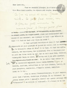 été publiée le 10 septembre 1942 dans Au pilori, dernière des quatre lettres de Céline publiées dans cette revue dirigée par Jean Lestandi. Dans son « Mémoire en défense », Céline a renié ces lettres, prétendant qu’elles ont été « arrangées, tripatouillées, faussées ».{CR}Ce tapuscrit, outre de nombreuses corrections et ajouts autographes, comprend l’insertion de trois importantes additions autographes par des béquets, de 4, 16 et 10 lignes, dont la conclusion. Il présente d’importantes variantes avec le texte publié.{CR}« Cher Lestandi, Vous me demandez pourquoi je n’écris plus ? Vous êtes bien aimable. Ma réponse est simple ». Et Céline ajoute de sa main : « Ce qui est écrit est écrit. Jamais de redites. Ce qu’il faut écrire, rien de plus, au juste moment. Le moment passé, le danger passé, place »… Il faut des écrivains, des négociants, « des diffamateurs, des bourriques, des innommables. J’en ai toujours une bonne meute au cul »… Puis il dénonce le « petit clan […] qui me veut soudain devenu anti-allemand et le va chuchoter partout, et pour mieux m’accabler encore : anarchiste. “Anarchiste” est un bon poignard, toujours facile à placer. Le mot suffit, il enfonce. Revanche des larbins. […] Tout fait charogne dans cette racaille, juifs, antisémites, vieux maçons, indicateurs de partout, jeunes ratés, soupirants du Front Popu, camouflés de tout, marchands d’étiquettes… Ah ! me supprimer quel rêve ! Place nette ! Pensez donc un tel témoin ! »…{CR}Plus loin, il ajoute de sa main (ce passage sera modifié dans le journal) : « Monzie ce vieux clown nous mijote une Histoire de France, maçonne et sémite j’imagine, que pourrait-il faire de mieux ? Grand ami de Bernard Lecache, Grand Protecteur du Tout Métèque, grand conférencier en Loges, membre d’honneur de la LICA ? Il s’agit bien assurément d’un tribut d’Hommage, au terme d’une fameuse carrière. Trois batteries pour la galipette ! La mystique est en bonne voie ! Déjà toute la presse jubile, encense, frétille de volupté ! Monzie se croise ! La France est sauvée ! J’attends que son œuvre figure au programme de toutes les écoles, avec commentaires de Raynaud, et l’Ode du maître à Worms »…{CR}Céline répond aux critiques et attaques dirigées contre lui, avant de conclure de sa main : « Ami notre saison s’avance ! Nous entrons dans un autre monde, demi morts déjà, de fatigue. Caron me doit un petit coin… une friture de Styx ! Non, je ne serai jamais triste, mort ou vivant… L’âme légère je vous salue, et vous attends ! »…{CR}Cahiers Céline 7, p. 168 (texte de l’article).