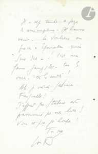 éditeurs.{CR}17-2 [sic pour mars]. Il lui demande du sucre et du thé, car il n’y en a plus au Danemark ; « le beurre on s’en passe »... Céline parle alors de ses éditeurs : « Sorlot promet vaguement un acompte pour le 15 ! Oh la tante ! il est coriace ! Mais c’est à rire – Rien de tragique... Il a déjà touché le pèze des souscripteurs. Il laisse venir. La Voiliers [maîtresse de Robert Denoël, et principale actionnaire des éditions] son procès en Epuration remis “sine die” ! C’est une femme gangster – tous les vices [...] Ah je voudrais séduire Fasquelle ! J’apprends que Staline est passionné par mes livres ! Vois ce que je loupe ! »...{CR}5 juillet. Il remercie les Daragnès de l’accueil réservé à Mikkelsen. « Du damné puant que j’étais depuis deux ans, en cul de basse fosse, je suis devenu le damné qui a tout de même des amis excellents »… Il attaque son prochain livre Féerie pour une autre fois : « je le débiterai en chapitres. L’avenir n’est à personne, à moi pas surtout ! Je suis sur le bombardement de Montmartre. Je vois que la soif du sang ne s’étanche guère en France. On arrivera à la Bombe Atomique avant l’amnistie si ça continue ! »… Il demande qu’on vienne le voir…{CR}25 juillet. Sur Gen Paul : « Je crois que le pauvre Gen va se dissoudre dans l’alcool. Je n’en retrouverai plus si je rentre jamais… quelques filaments de rigolade un peu de fiel, quelques cristaux de génie… un bocal »… Il conseille d’aller voir Jacques Deval, qui va rentrer en France… « On me propose de m’imprimer en Suisse et en France aussi, mais je me gratte… Les successeurs de Denoël en tout cas sont des beaux fumiers ! Pas un geste ! Pas un mot ! »…{CR}On joint une L.A.S., 1er mai [1947], à Mme Daragnès (1 page et demie in-4), l’avertissant que Mikkelsen a remis son voyage à Paris. « Notre situation est redevenue sinistre. Je suis l’objet des attaques du journal communiste danois Land o Folk qui cherche pouille au gouvernement à mon sujet, qui trouve évident que ma place n’est pas à l’hôpital, mais en France, au cachot, aux poteaux etc. »