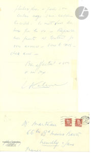 Louis-Ferdinand CÉLINE. L.A.S. « LF Céline », [Korsør] le 3 [juillet 1950], à son ami Paul Marteau à Neuilly ; 2 pages in-fol., enveloppe.{CR}Souvenir de sa mère.{CR}Il est rentré à Korsør. « Je me prends à penser que ma mère...