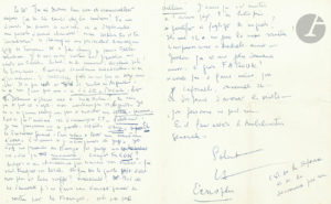 Louis-Ferdinand CÉLINE. 5 L.A.S. « LF », [Korsør 1950-1951 ?], à Robert Le Vigan ; 2 pages petit in-4 et 7 pages in-fol., une enveloppe à Adrogue (Argentine).{CR}Lettres inédites à l’acteur {CR}Le 21. « Tu est devenu bien con et...