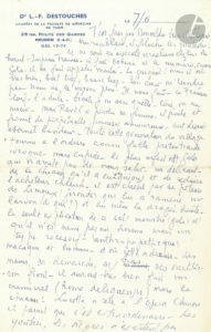 Louis-Ferdinand CÉLINE. 4 L.A.S. « Louis » ou « LF », [Meudon juin-octobre 1956], à Robert Le Vigan ; 2 pages in-8 chaque (la 1ère à son en-tête Dr L.-F. Destouches).{CR}Lettres inédites à l’acteur. {CR}7 juin. Nouvelles de...
