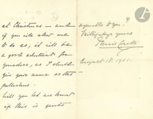 Marie CORELLI (1855-1924) romancière britannique. L.A.S., Stratford on Avon 18 août 1901 ; 2 pages et demie in-8 à ses chiffre et adresse ; en anglais.{CR}Au sujet de ses chansons que ses correspondants ont achetées, auxquelles elle ne pense...