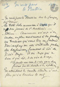 Léon DAUDET (1868-1942). Manuscrit autographe, En route pour le Panthéon, [1908] ; 1 page in-fol. chiffrée 44.{CR}Contre l’entrée de Zola au Panthéon. {CR}« En route pour le Panthéon sur les fourgons de l’Étranger. Le triste Zola...