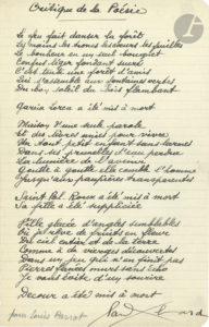 1944 ; il a été également publié dans Poésie 44 (n° 20).{CR}Éluard y évoque les morts de Garcia Lorca, de Saint-Pol Roux (et le supplice de sa fille Divine), et de Jacques Decour.{CR}Le poème, de 25 vers, est soigneusement écrit à l’encre noire ; les deux premiers vers présentent des variantes avec le texte publié.{CR}« Le feu fait danser la forêt{CR}Les mains les troncs les cœurs les feuilles{CR}Le bonheur en un seul bouquet{CR}Confus léger fondant sucré{CR}C’est toute une forêt d’amis{CR}Qui s’assemble aux fontaines vertes{CR}Du bon soleil du bois flambant{CR}Garcia Lorca a été mis à mort »…{CR}Au bas du poème, Eluard a inscrit au crayon la dédicace : « pour Louis Parrot ».