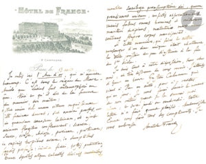 femme du meunier, qui avait tous les défauts : cruelle, impudique, ivrogne, obstinée, acariâtre ; et, sacrilège, elle feignait de révérer un Dieu qu’elle disait être unique ; elle trompait tous les hommes et son malheureux mari… Il commente : « Si cette meunière, qui feint le culte mensonger d’un dieu unique était chrétienne, la secte jouissait de peu d’estime à la fin du 1er siècle ». Il attend la visite de Gaston Calmann « qui vient à Pau en auto »…{CR}On joint une page autographe (chiffrée 54), avec des ratures et corrections, pour Les Dieux ont soif sur le marchand d’estampes Jean Blaise, qui présente des variantes avec le texte publié : « Comme tous les contre-révolutionnaires, il avait de la considération pour les puissances de la république et depuis qu’il avait été dénoncé pour fraude dans les fournitures de l’armée, le tribunal révolutionnaire lui inspirait une crainte respectueuse. […] Plusieurs fois, chaque année, il emmenait pour deux ou trois jours dans les environs de Paris des peintres qui dessinaient, sur ses indications, des paysages et des ruines, qu’il éditait et dont il tirait grand profit dans la concurrence qu’il faisait aux peintres Robert, Demarne ou Demachy. Cette fois, il résolut d’emmener le citoyen Gamelin pour faire des fabriques car le juré avait pour lui grandi le peintre ».