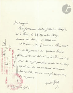 André GIDE (1869-1951). P.A.S., 22 janvier 1924 ; 1 page in-4, avec cachet administratif.{CR}Certificat pour Pierre Klossowski.{CR}« Je, soussigné Paul Guillaume André Gide – Français, né à Paris, le 22 Novembre 1869, homme de lettres,...