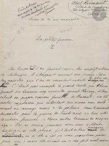 rogné (L. Bernard).{CR}Manuscrit complet de ce roman.{CR}La Petite Femme, publié au début de 1914 à la Librairie Alphonse Lemerre, est le deuxième volume des Scènes de la vie cosmopolite, troisième cycle romanesque d’Abel Hermant après les Scènes de la vie des cours et des ambassades, et les Mémoires pour servir à l’histoire de la société.{CR}Le roman est un tableau de mœurs modernes, l’histoire quelque peu scabreuse d’un ménage à trois, contée dans le style élégant de ce puriste de la langue française. Ce sont d’abord deux amis, inséparables, Jacques Prieur, jeune banquier français envoyé dans la succursale londonienne, et Eddy, un de ses jeunes employés ; il sont inséparables, et se partagent les faveurs d’Aline Duval, une charmante petite modiste. Jacques va se lier avec Sarah Ellington, fille du directeur de la banque, avec laquelle il se fiance. À la suite d’un accident, Eddy hérite du titre de duc de Crichton et Maddox et d’une grande fortune. Il invite les jeunes mariés dans son château de Woodstock, puis les rejoint pendant leur voyage de noces en Italie ; sur le bateau de Naples à Palerme, Jacques souffrant du mal de mer, Eddy console Sarah. Jacques, poussé par sa mère, divorce et Sarah épouse le duc de Chricton. Après un exil en France, Jacques revient en Angleterre ; et le ménage à trois reprend.{CR}Le manuscrit est soigneusement mis au net au recto des feuillets, sans marges, à l’encre bleu nuit ou noire, avec cependant de nombreuses ratures et corrections. Il comprend 37 chapitres, chacun signé en tête (avec son adresse, et demande de renvoyer la copie avec les épreuves) et en fin. Le dernier chapitre est daté « Tylehurst, dimanche 13 janvier 1913 ». Le chap. xxxvi (3 p. sur 2 ff. pag. 312bis-313) est d’une écriture cursive très serrée.{CR}On joint les épreuves corrigées du livre, un vol. in-8 de 372 p. (daté en fin « Londres, Tylehurst, 1913 »), avec en tête une page autographe donnant la liste des trois Scènes de la vie cosmopolite ; reliure demi-chagrin bleu, dos orné, étui.