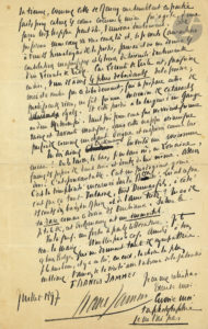 revue belge Le Coq rouge : « Je reçois des Gide une lettre élogieusement angoissée. Ils me couvrent de lauriers au sujet de mon poème La Mort du poète qui, s’il est triste comme la mort elle-même, est je crois ce que j’ai fait de plus terriblement beau. Il terminera probablement le volume que j’ai l’intention de publier [De l’Angélus de l’aube à l’Angélus du soir]. J’ai senti en l’écrivant, la mort couler dans mes veines. J’ai eu véritablement le délire. J’ai été à la fois le poète, l’auteur, la mère, la fiancée, l’ami, la servante, le chien, etc... et, en le terminant, j’ai failli me révolter contre le Ciel, comme si, véritablement, j’avais vécu cette mort. Je ne sais pas ce qui se passe en moi quand j’écris de telles choses. C’est effrayant. Et toi, tu sais quel profond repos me donnent tes phrases ardentes et calmes. Quel jaillissement de vérité, de jeunesse, de poésie, s’émanent de tes phrases maladroites et cabrées, de tes chocs, des calmes tournoiements de tes valses foraines, sous la chênaie obscure où tremble l’adieu du jour. Les âmes comme la tienne, comme celle de Rency me semblent en partie faites pour calmer les cœurs comme le mien qu’agite, d’une façon trop tragique peut-être, l’univers douloureux. De préférence mon cœur va vers ceux-là, et si je mets Lamartine à l’un des himalayas de la poésie, jamais il ne me donna les consolations magnifiques et les leçons de sérénité douloureuse d’un Leconte de Lisle. Car Leconte de Lisle est, quoiqu’on en dise, l’une des âmes les plus débordantes de la poésie ; mais il a voulu que ce débordement, qui se prépare entre de prodigieuses rives, ne fût qu’une succession de cataractes égales. Et cette poésie a la largeur d’un Gange ou d’un Mississipi. Tant pis pour ceux qui ne voient qu’une vaine et savante musique, dans cette nappe océanique profonde comme un chant d’orgue et inspirée comme lui.{CR}Tu dois aimer Erckmann ? En voilà un méconnu encore ! On le laisse, là-bas, je ne sais où, en Lorraine, fumer des pipes de deux sous et douter de lui-même. Allons donc ! C’est épouvantable. C’est un prodigieux génie. C’est la simplicité incarnée dans la Bonté. Qu’est-ce que c’est que ça tout Verlaine, tout Dumas Fils, à côté des Contes des bords du Rhin et de l’Ami Fritz ? Tu es de sa race comme ce divin des Ombiaux. Salue-le. Je te le dis, cet Erckmann est un immortel.{CR}Voilà que je me fiche à parler littérature. [.. .1 Amitiés à tous ces bons Belges qui me donnent tant de sympathie. Je le sens bien, il y a en toi, en eux, la chose la plus sublime : l’amour de la vérité avec l’absence de la jalousie »...{CR}Mars 1898. Jammes félicite chaleureusement Vandeputte : « Quel délicieux oiseau chante en ces poésies gracieuses comme des adolescentes vierges qui ont de grands chapeaux sous les lilas ? Tu es poète. Tu l’es comme un pauvre est pauvre, comme la neige est blanche ; il y a là des cris d’azur filés par des gosiers d’oiseaux gris de cerises d’aube »... Jammes est reconnaissant à Vandeputte, à Ruyters et à Rency d’avoir été « de ceux qui commencèrent à gueuler en ma faveur, et à secouer la “colonne de silence” où me tenaient les impuissants ou les crétins qui ont peur de mes feuilles de chêne »...{CR}Ancienne collection André Bertaut (14 décembre 1983, n°164).